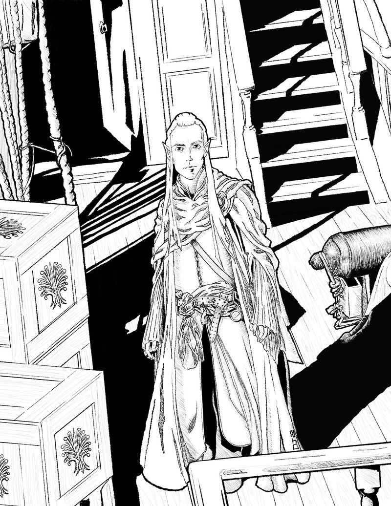 "The elf stepped out onto the weather deck and surveyed the battle. From within his robes, he drew an ironwood staff that shouldn't have been able to fit there.